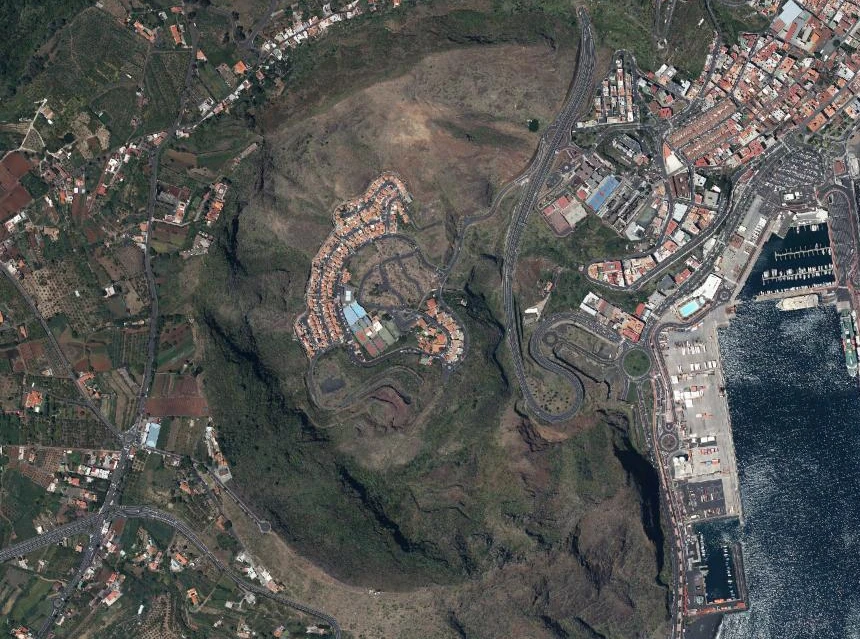 El relieve de esta isla es absolutamente impresionante. Lo que más destaca a primera vista es la Caldera de Taburiente, la sobrecogedora depresión volcánica modelada por la erosión que ocupa el centro de la mitad septentrional de la isla. También destaca el perfil de Cumbre Nueva, que se extiende en dirección norte-sur, descendiendo hasta desgranarse en una sucesión de cráteres menores que jalonan toda la extensión del Parque Natural Cumbre Vieja. Además de estos grandes accidentes geográficos, la isla ofrece muchos otros detalles, algunos francamente únicos, como el de este cráter poblado junto a Santa Cruz de la Palma: